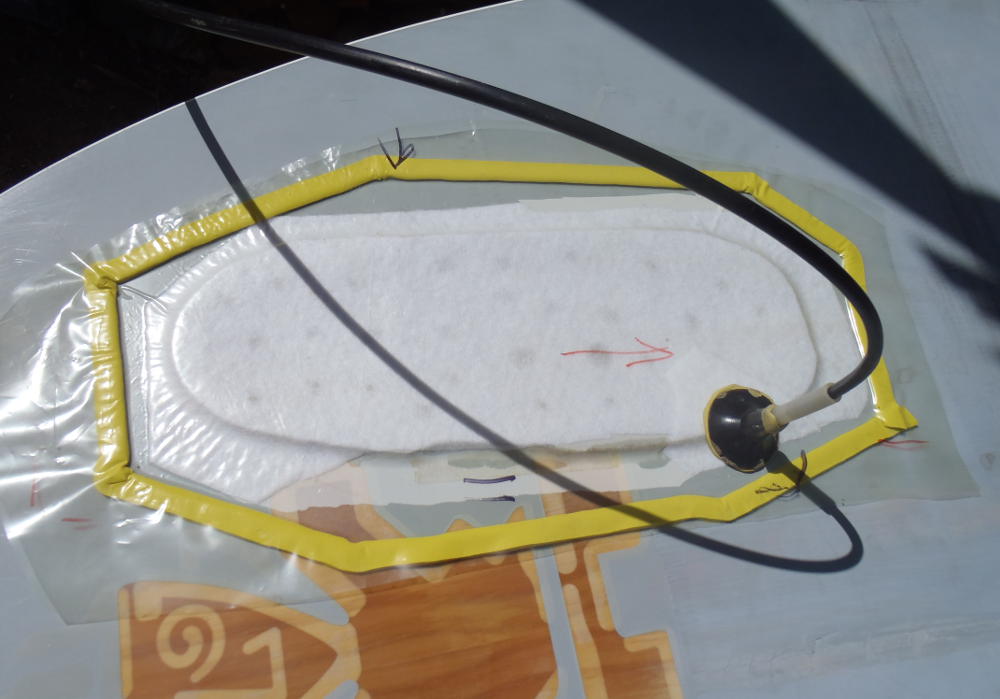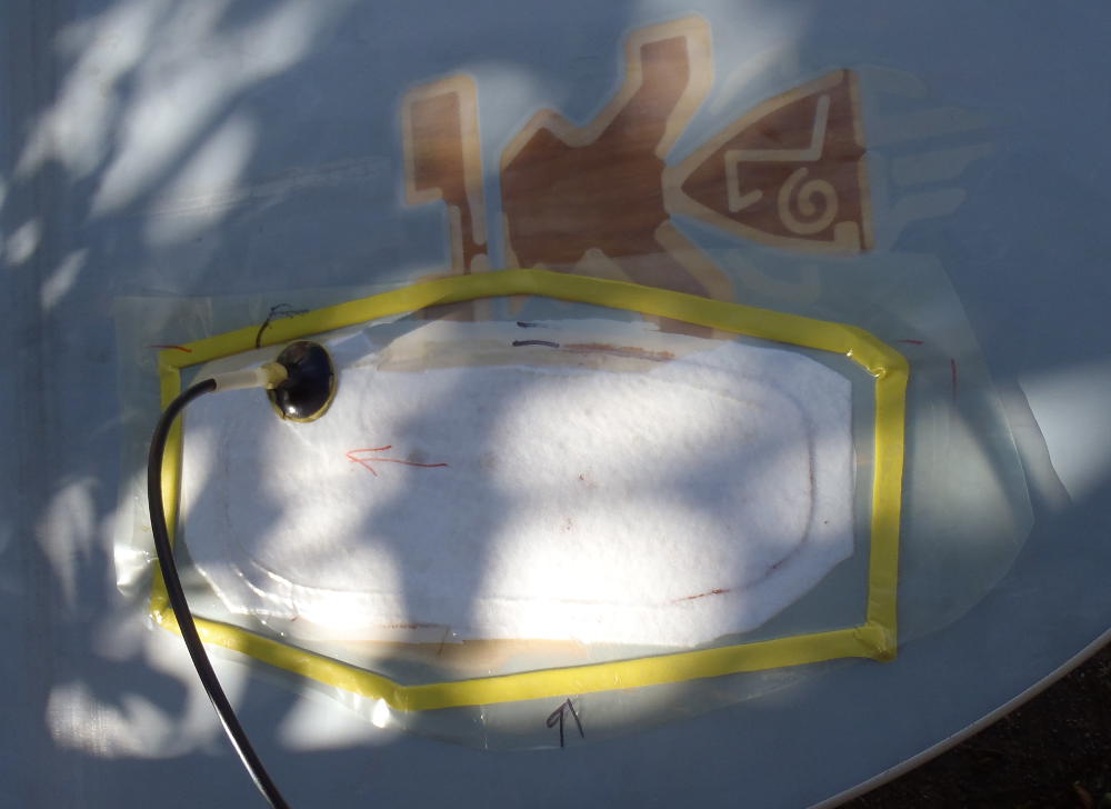 all laid out for first round of vacuum-bagging (new inner glass plus 1/8" Divinny) - on a hot day, you have got to have your ducks in a row!