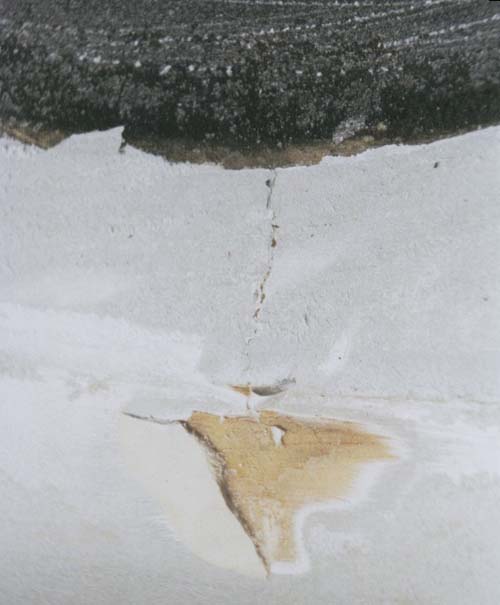 beneath the forward heel bumper, a vertical crack. Beneath, covered by some Marinetex, a horizontal (longitudinal) crack, that was the first indication